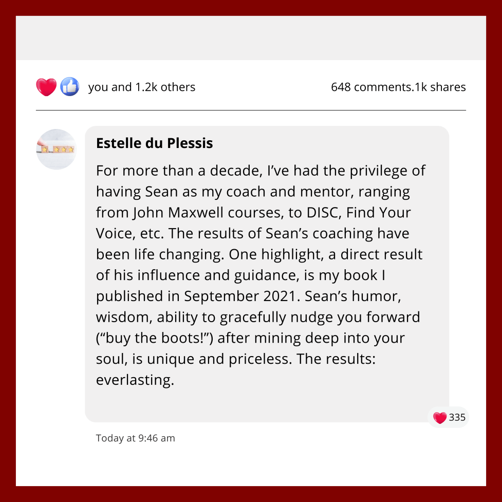 A: Sean is an entrepreneur, ex-pharmacist, certified John Maxwell speaker, coach & trainer, and a certified DISC consultant. He’s been married to Michele for over 34 years, is a proud dad to two young adults in their 20s, and is a coffee-loving, grace-driven guy who helps people transform their lives from the inside out.