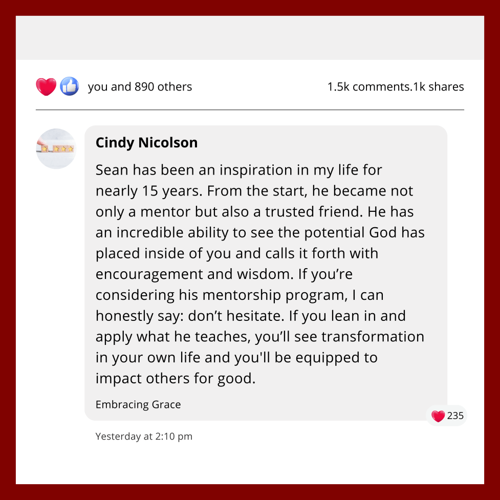 A: Sean is an entrepreneur, ex-pharmacist, certified John Maxwell speaker, coach & trainer, and a certified DISC consultant. He’s been married to Michele for over 34 years, is a proud dad to two young adults in their 20s, and is a coffee-loving, grace-driven guy who helps people transform their lives from the inside out.